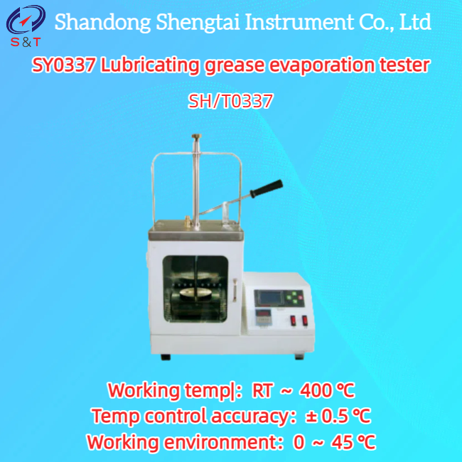 SY0337 Testeur d'évaporation de la graisse lubrifiante Cet instrument est conçu et fabriqué conformément à la norme SH/T0337 et convient à la mesure de l'évaporation de la graisse lubrifiante. Place an evaporating dish filled with 1mm thick lubricating grease in a specialized thermostat and maintain it at the specified temperature for 1 hour (or as specified in the lubricating grease product standard) to measure the mass loss.