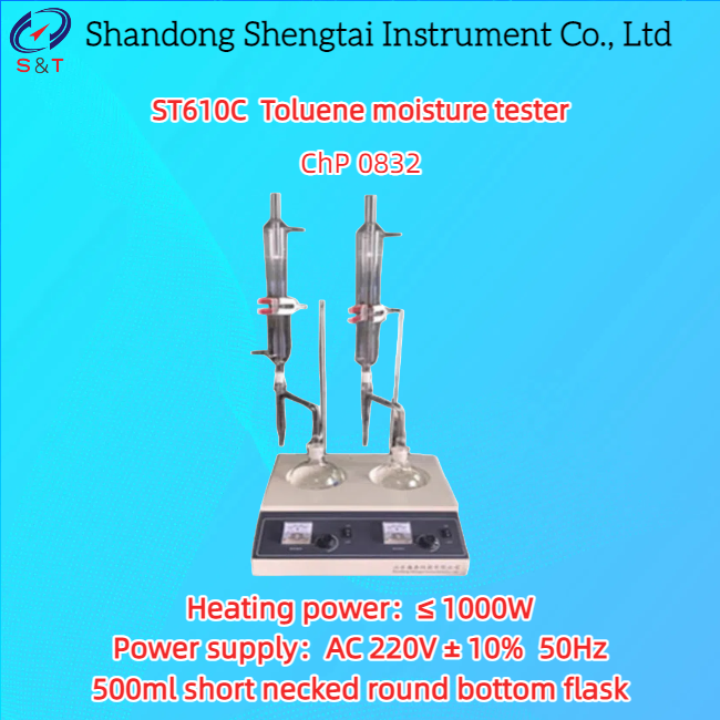 Le testeur d'humidité par méthode au toluène ST610C est conçu et fabriqué conformément aux exigences techniques et aux réglementations pertinentes de la quatrième méthode au toluène dans la Pharmacopée 2025, méthode 0832 de détermination de l'humidité. Il est principalement adapté à la détermination de l'humidité des matières médicinales chinoises, des préparations et d'autres matériaux.