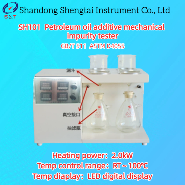 Le testeur d'impuretés mécaniques SH101 est conçu conformément aux exigences de la norme nationale GB/T 511 "Méthode de détermination des impuretés mécaniques des produits pétroliers et des additifs (méthode du poids) "Il est adapté à la détermination de toutes sortes d'huiles légères et lourdes, d'huiles lubrifiantes et d'additifs, de la teneur en impuretés mécaniques dans les produits pétroliers.