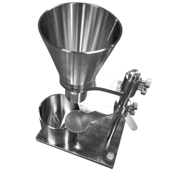 Une certaine quantité d'échantillon est passée à travers un entonnoir conique et entre dans un récipient cylindrique de volume connu pour déterminer la masse de l'échantillon nécessaire pour remplir le récipient.