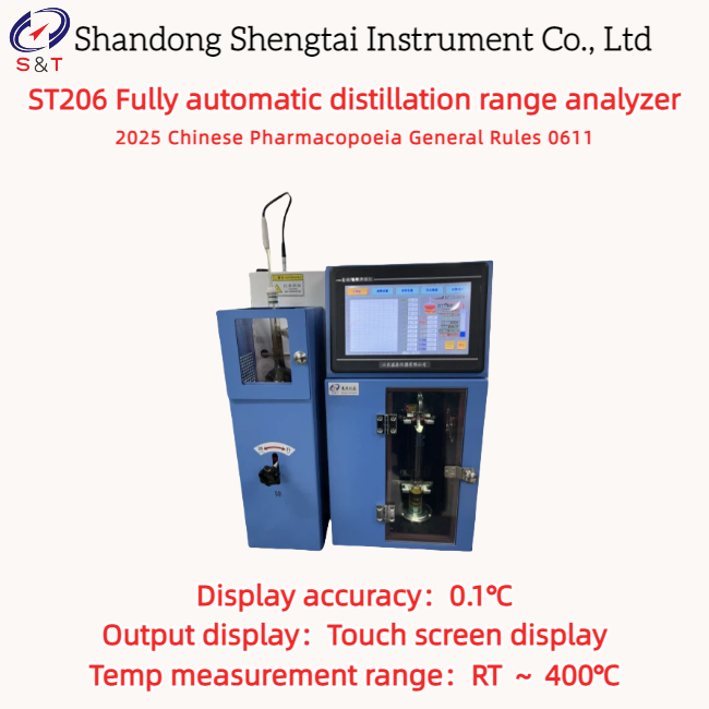 L'analyseur de gamme de distillation entièrement automatique ST206 est équipé d'un écran LCD couleur, d'un dialogue homme-machine en chinois, d'un fonctionnement guidé et d'un processus de mesure entièrement automatisé.Conçue conformément aux prescriptions de la règle générale 0611 de la pharmacopée chinoise 2025 concernant la méthode de détermination de la plage de distillation, la plage de distillation désigne la plage de température d'un liquide distillé selon la méthode suivante, étalonnée à la pression atmosphérique standard [101,3 kPa (760 mmHg) ],depuis le début de la distillation de la cinquième goutte jusqu'à ce que seulement 3-4 ml ou une certaine proportion du volume de l'échantillon d'essai soient distillés.
