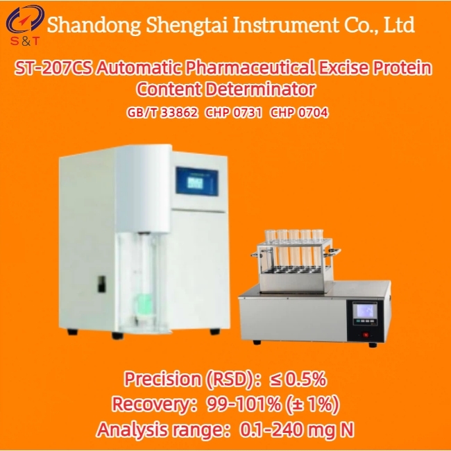 ST-207CS Automatic Pharmaceutical Excise Protein Content Determinator is a fully automated "nitrogen" (protein) analysis system developed based on the classic Kjetliner nitrogen determination technology and color method to determine the end point. Its method and manufacturing are in line with GB/T 33862-2017 Fully (Semi) Automatic Kjetliner Nitrogen Determinator and 2020 Chinese Pharmacopoeia 0731 Protein Content Determination Method Method I Kjetliner Nitrogen Determination Method and 0704 Nitrogen Determination Method III Nitrogen Determination Method.